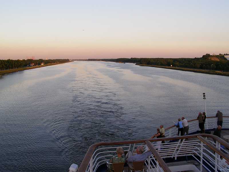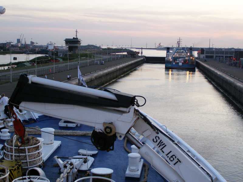 when we reached the lock, which we had to go through before continuing our journey. The water was calm and we followed another ship into the lock and waited for the water