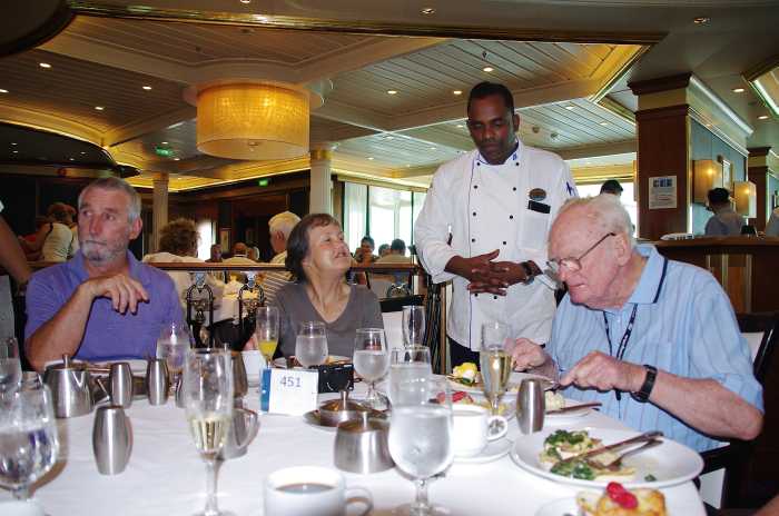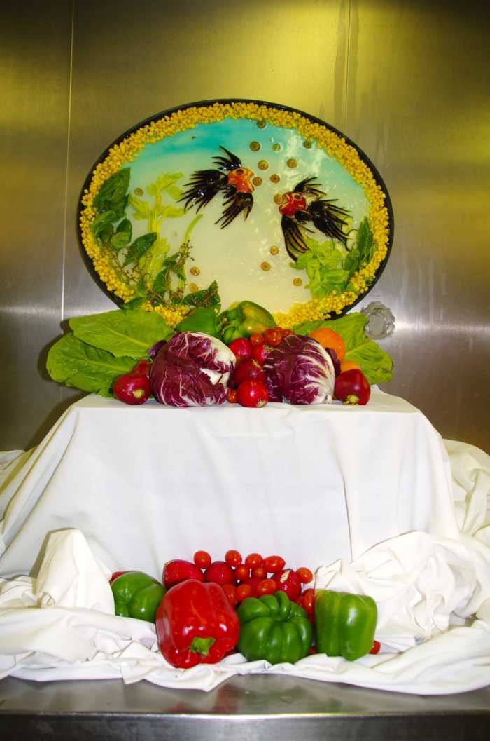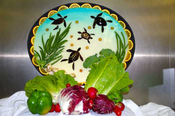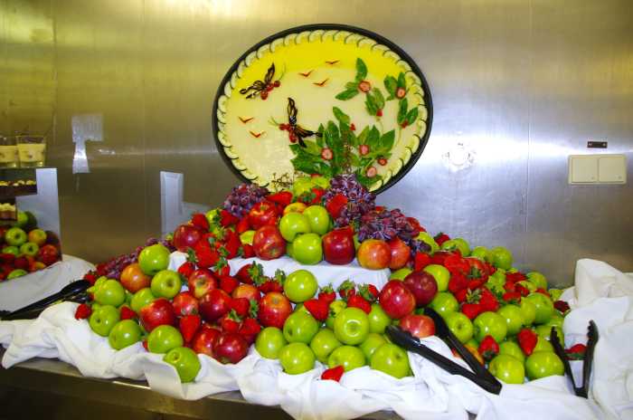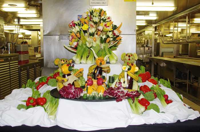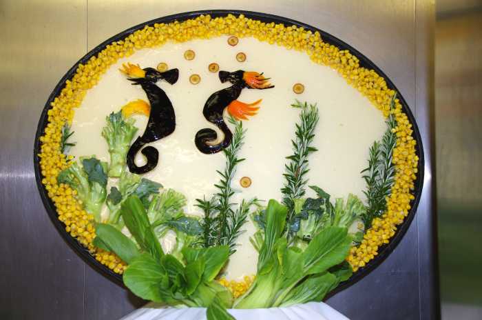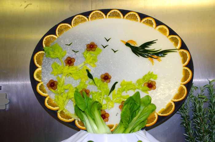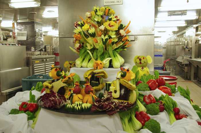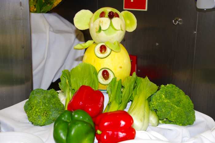 One of the exceptional tours we had on this voyage was a Galley Tour, courtesy of the chefs and kitchen staff to show their skills at presentations. Our wonderful dinner group, that we had lots of fun with at all times, decided to do this as a farewell activity. First we went for a tour through the galleys and saw staff at work and the finished products on display. We could see the wonderful fun and clever carvings on display. What a brilliant way to show talent and we did enjoy eating the fruits of their labours….