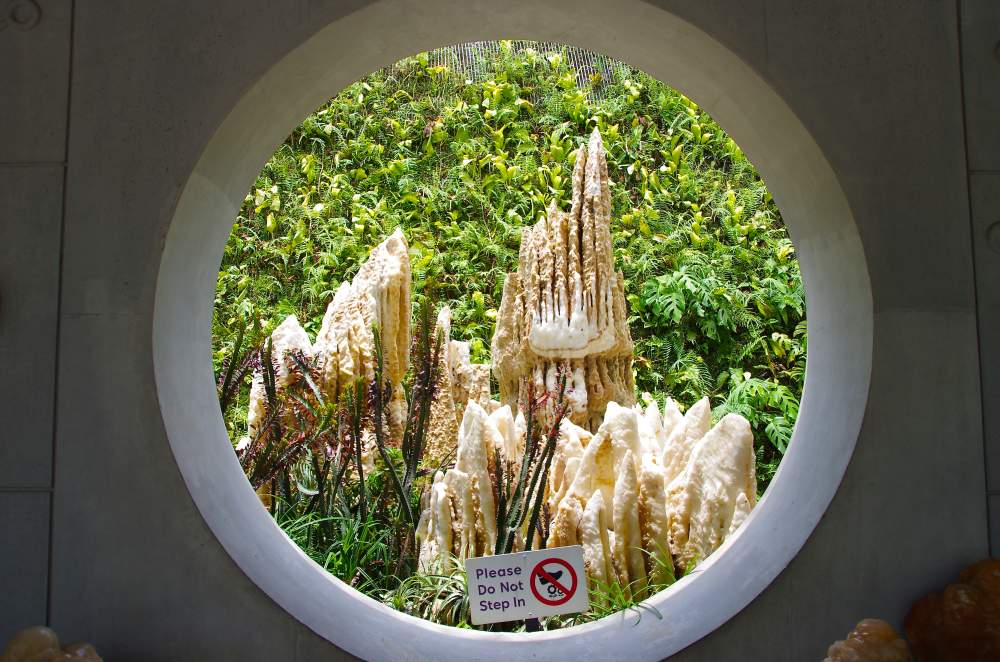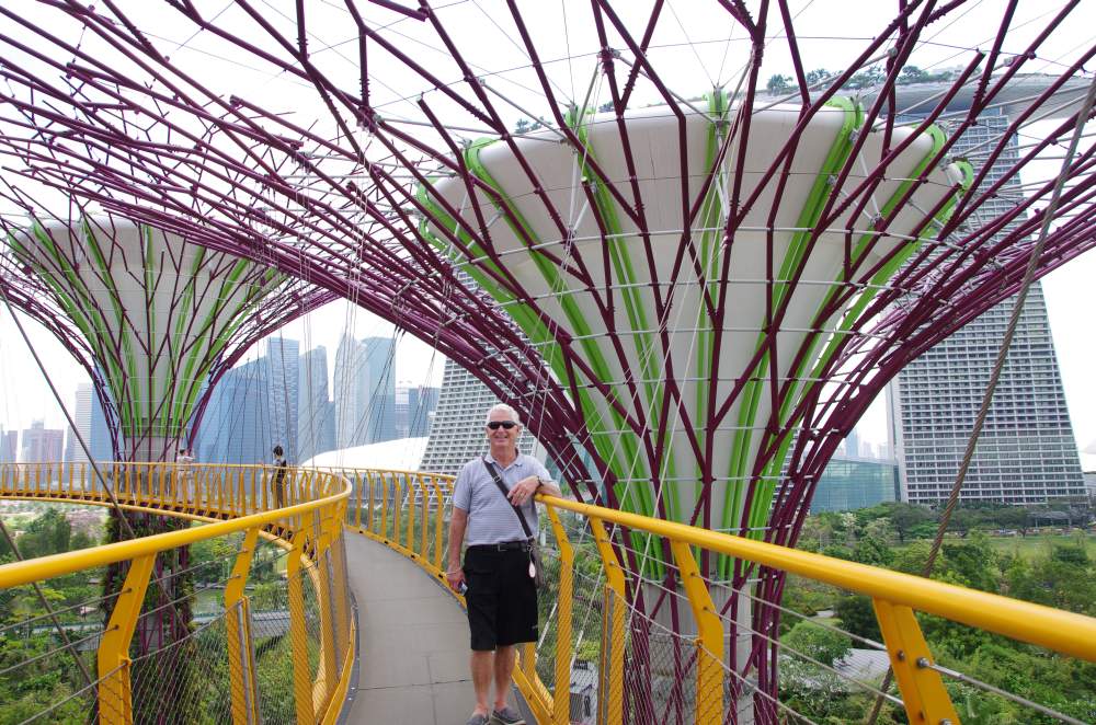 Today we are going to see the Gardens by the Sea. We headed for the Marina Bay MRT Station and could see the fabulous boat shape hotel in the distance so we assumed the Gardens were near by. After crossing the river we entered the complex of which there are three sections, Bay South, East and Central of which area has its own type of attraction. We decided to catch the mini train around this huge complex which houses about 380,000 plants and trees and to get an idea of the layout. Passing the Supertrees gave us the incentive to begin our explorations here.