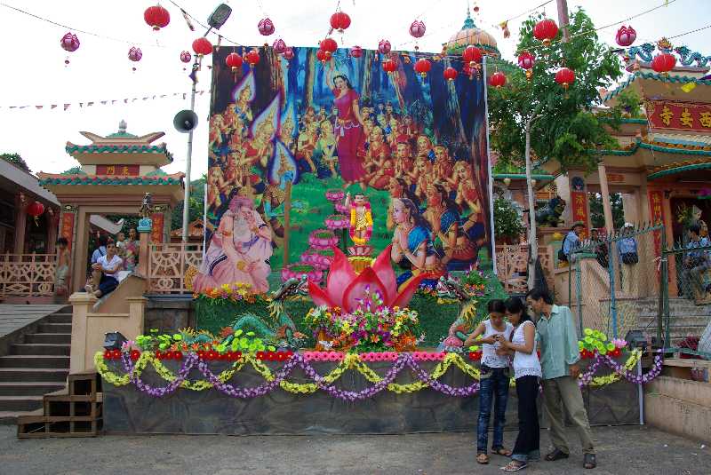 This morning saw us take a 3 hour another boat trip to see the Cai rang - the Phong Dien Floating Market. What an incredible landscape - boats of all sizes everywhere. All full of items to sell and one of the most interesting forms of advertising to us was the tall sticks on the boats that showed what items the seller had. For instance the pineapple sellers had pineapples up and so on. After this we headed across the river to visit the tropical fruit gardens and have lunch. It was raining here and made getting around a little difficult but we really enjoyed the fruits and the special tea. Lunch was an absolute delight! Pho first, and then an elephant fish and salad beautifully presented. A wonderful visit and then to make it special we went for a trip in small boats through the tall green growth of the small islets. Then it was time to head for ChauDoc where we stayed overnight. We made a visit to Sam Mountain in the late afternoon to look out over Cambodia and then back into the village as there was a ceremony in the local temple.