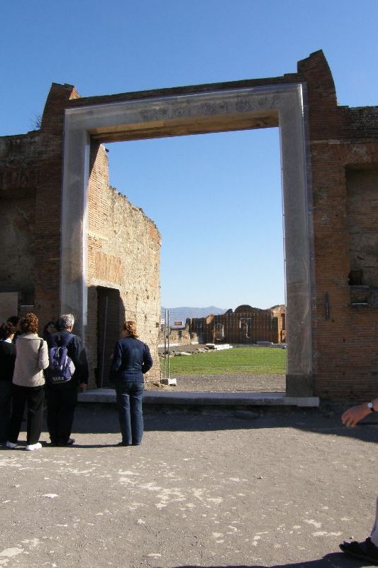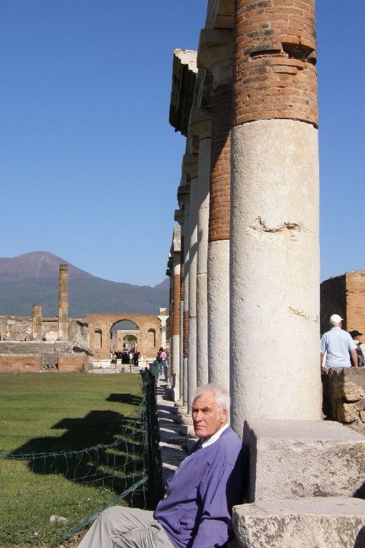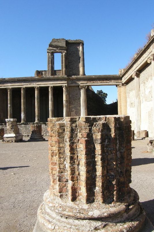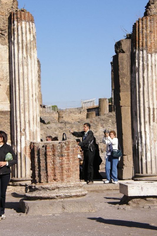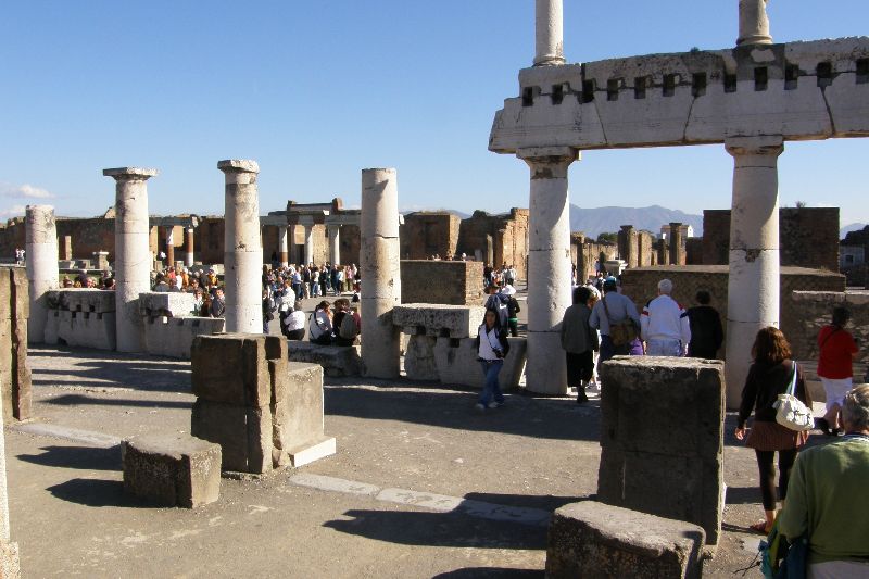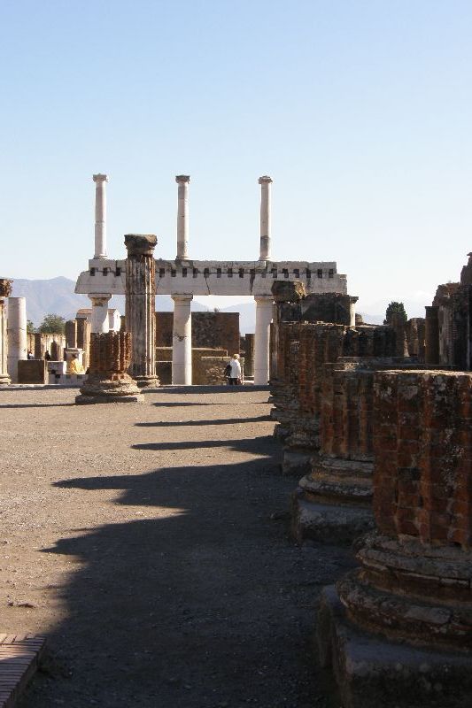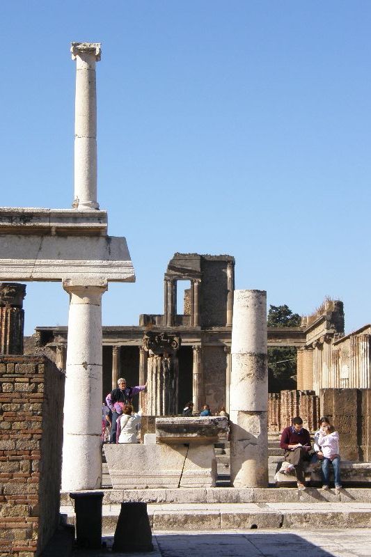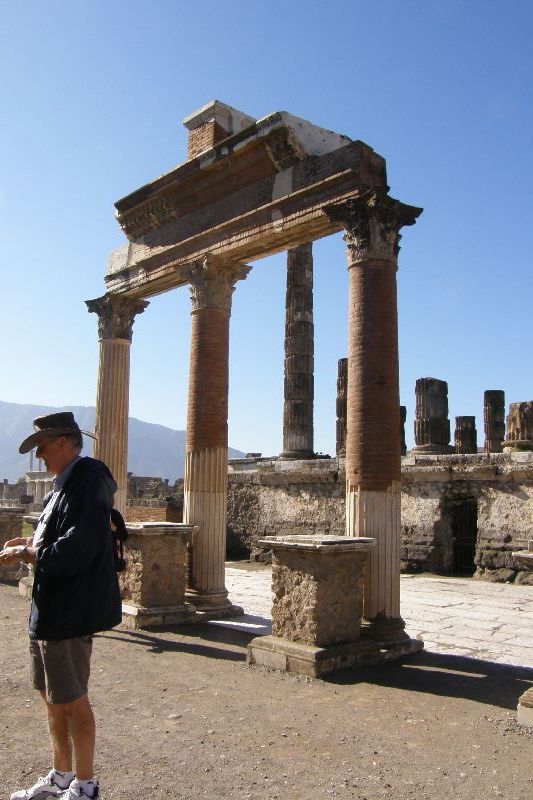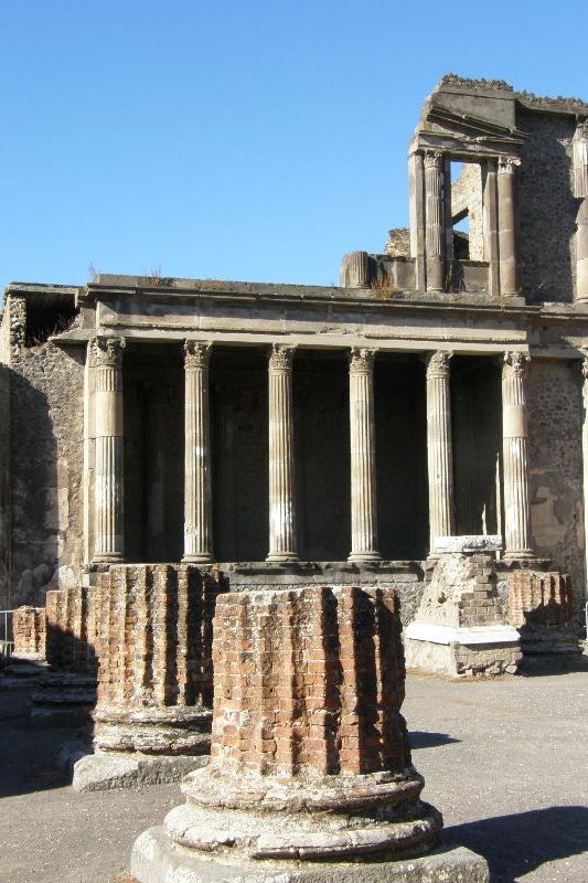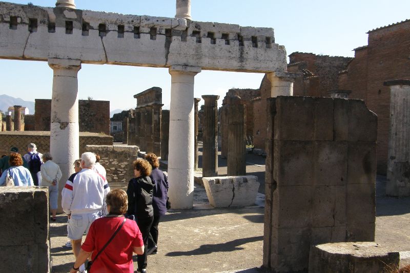 Our tour today is to visit the amazing Ruins of Pompeii to see the remaining structures and how people lived centuries ago. Boarding our coach in Sorrento we left and wound our way along the brilliant Amalfi coastline and soon the magnificent Mount Vesuvius appeared on the skyline. On the 26th August, 79AD this mountain erupted spewing volcanic mud and lava all over the town, catching the people of Pompeii at their everyday tasks. We entered this archaelogical site and when receiving our tickets were given a little book that explains what a lot of the sites are. very helpful! We did have a very experienced tour guide and he gave us ongoing commentary as we walked around. There were about 20,000 people here and evidence shows that the Roman way of life indicated that they had a very complete lifestyle including theatres, public baths, shops and they embraced art in many facets of their everyday activities. We entered through one of the seven gates of Pompeii and soon came across the Temple of Venus. There is not much left today but indications are that it was made of marble along with natural stone. The Basilica was quite close by and the remains of the columns in the centre show the size it may have been. The portico with a section of the second floor were incredible to see. The Forum was next in our sights and it was the city's main square and and such a very busy part of the city.