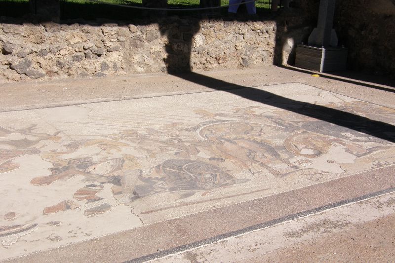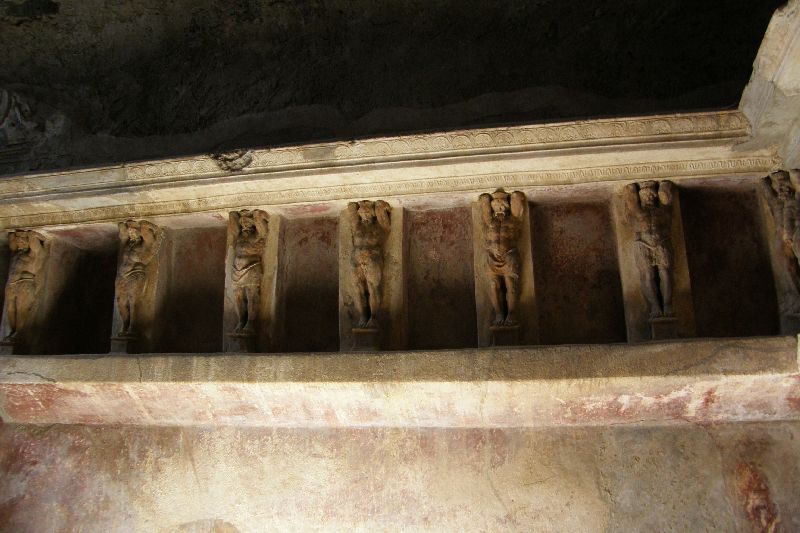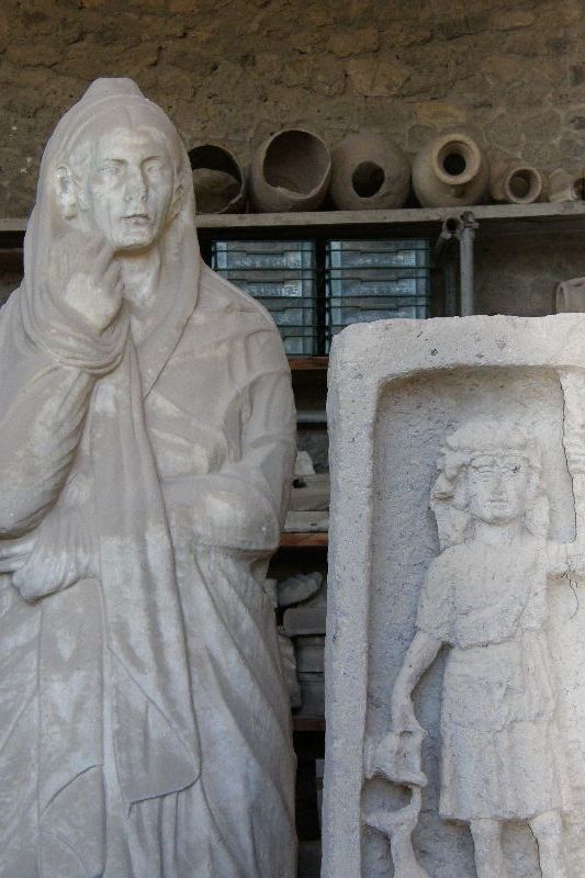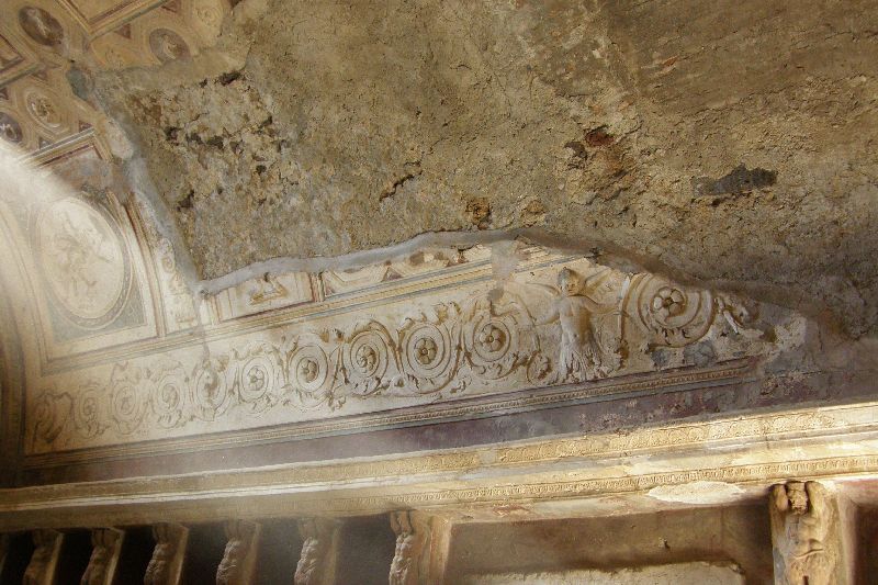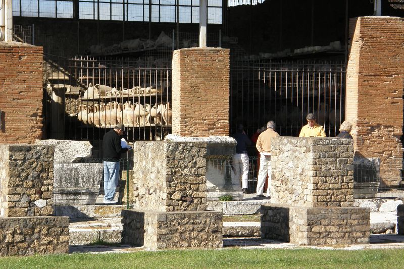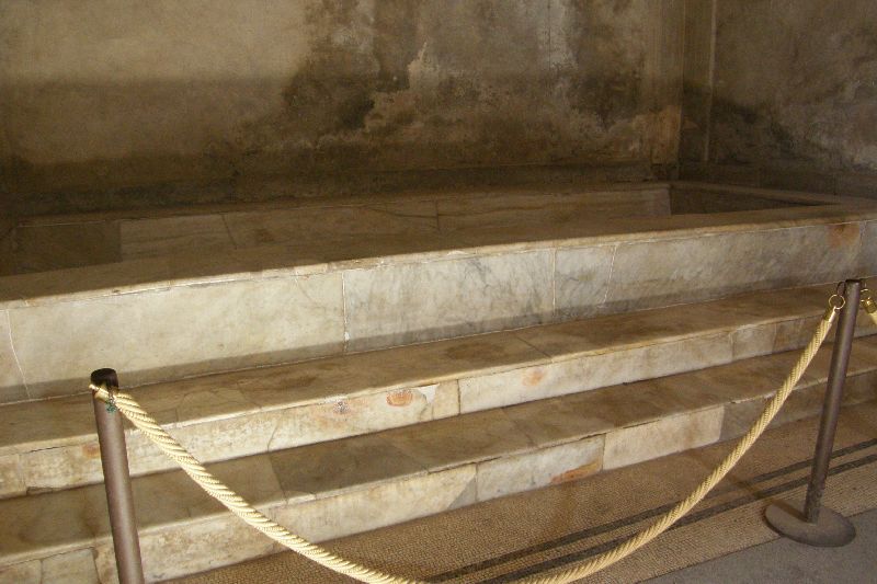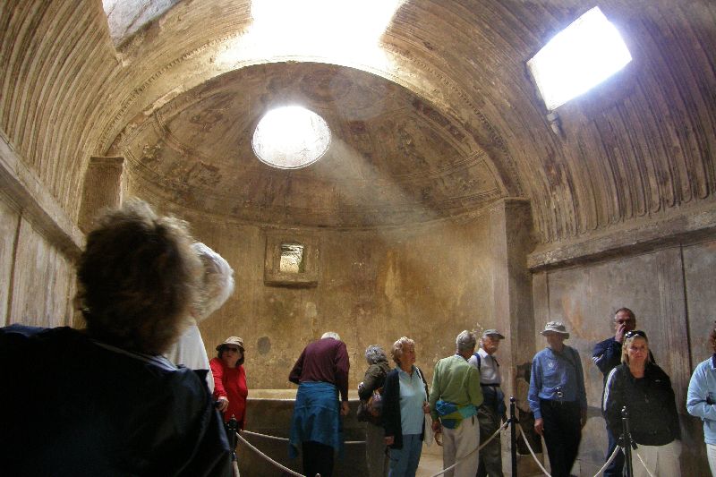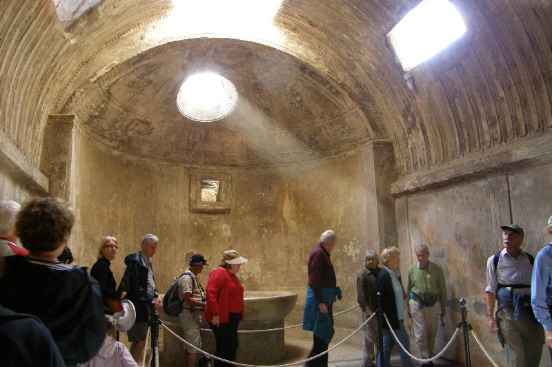 The Forum Granary had some plaster casts of people and animals that have been recovered from the site and we found them incredible down to the expressions on their faces or frozen movement of their bodies. The actual remains have been relocated in other places because of their historical importance. Other pieces of goods are here such as jugs, vases and pieces of furniture of the era. We then visited the Forum Baths that were built after 80BC. There were two rooms here, one for heating and one for bathing and both had decorations on the walls and ceilings as well as statues around the rooms in appropriate places.