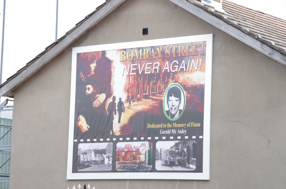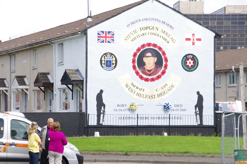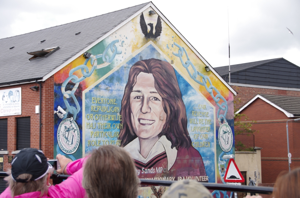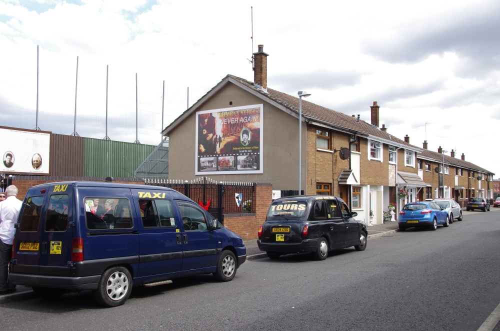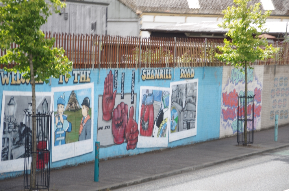 Today we were off on a Paddy Campbell's Black Taxi Cab Tour. We had 2 guides, One was George Clooney (or looked like!) and Jim. Driving along the road we could see the fence that seperates the Catholics and the Protestant areas. Many flags were flying and soon we stopped to see the collection of murals that represent some of the Martyrs and others that are prominent in Irish history. The road stretches westwards for approximately 2.4 km from central Belfast and is lined, to an extent, by shops. The residents live in the many streets which branch off the main road. Houses are built quite close to the road. Everywhere are reminders of the challenges that people have faced
