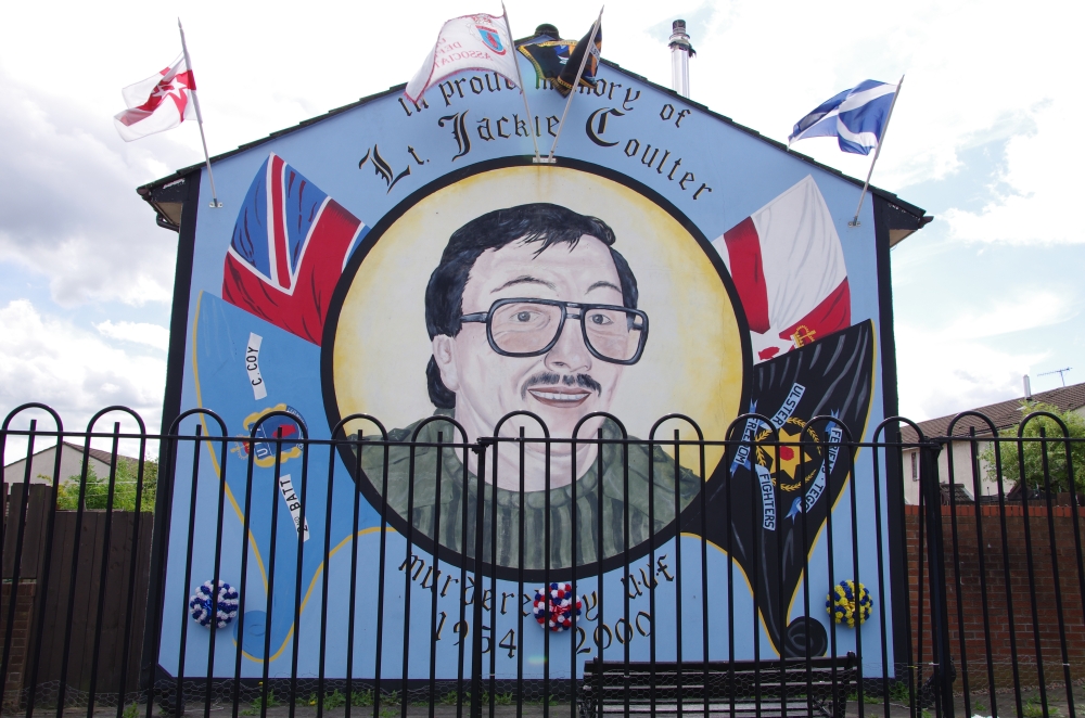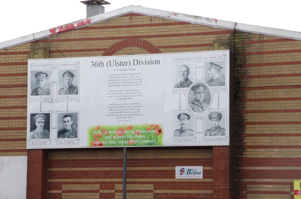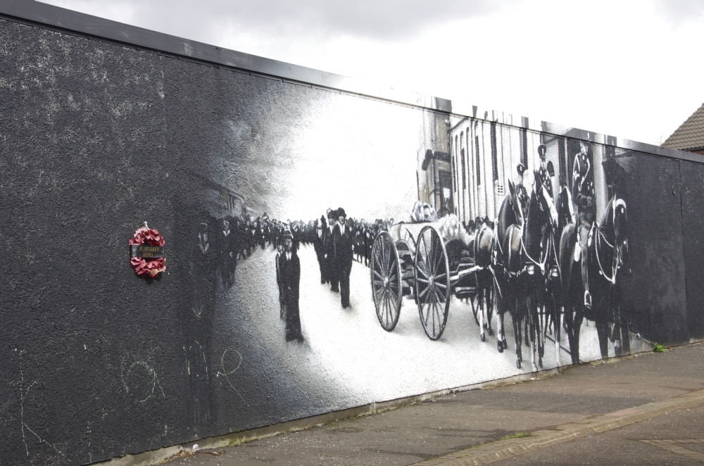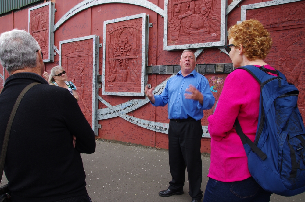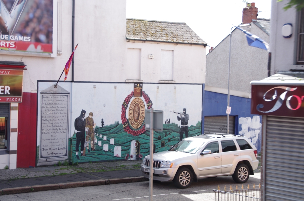 Today we were off on a Paddy Campbell's Black Taxi Cab Tour. We had 2 guides, One was George Clooney (or looked like!) and Jim. Driving along the road we could see the fence that seperates the Catholics and the Protestant areas. Many flags were flying and soon we stopped to see the collection of murals that represent some of the Martyrs and others that are prominent in Irish history. The road stretches westwards for approximately 2.4 km from central Belfast and is lined, to an extent, by shops. The residents live in the many streets which branch off the main road. Houses are built quite close to the road. Everywhere are reminders of the challenges that people have faced