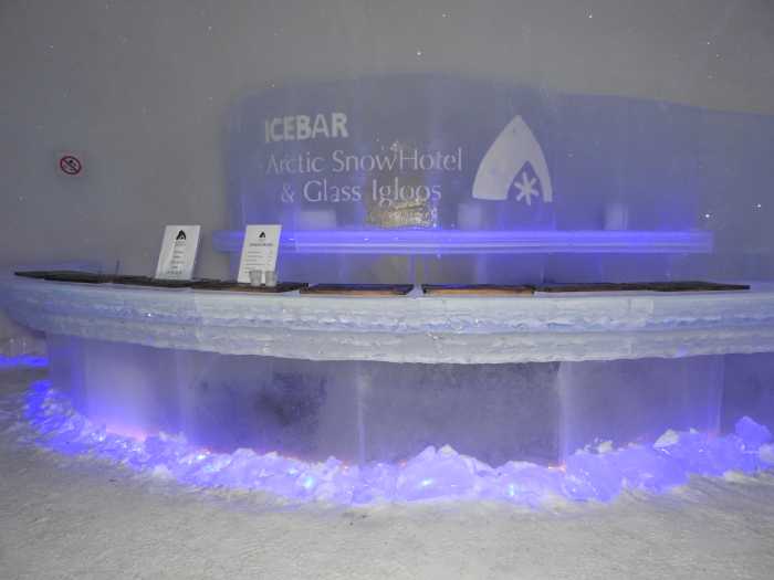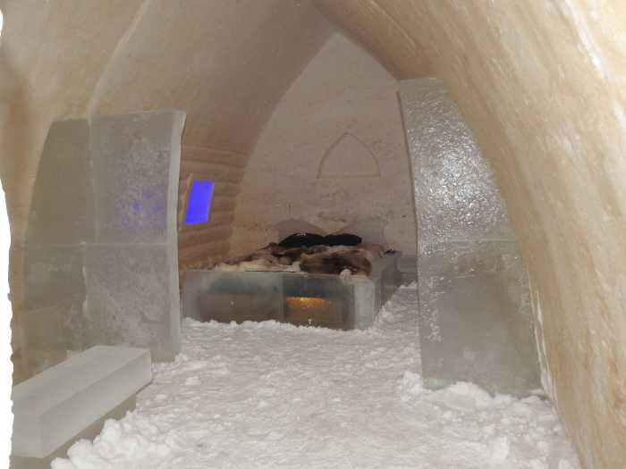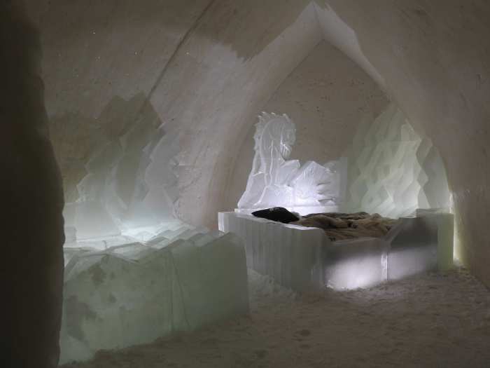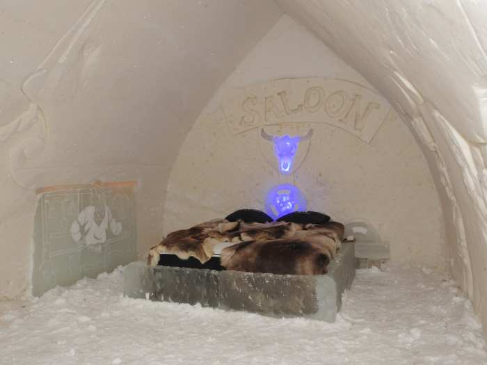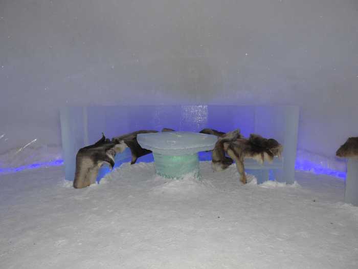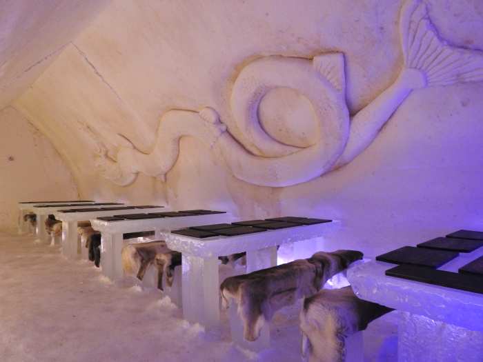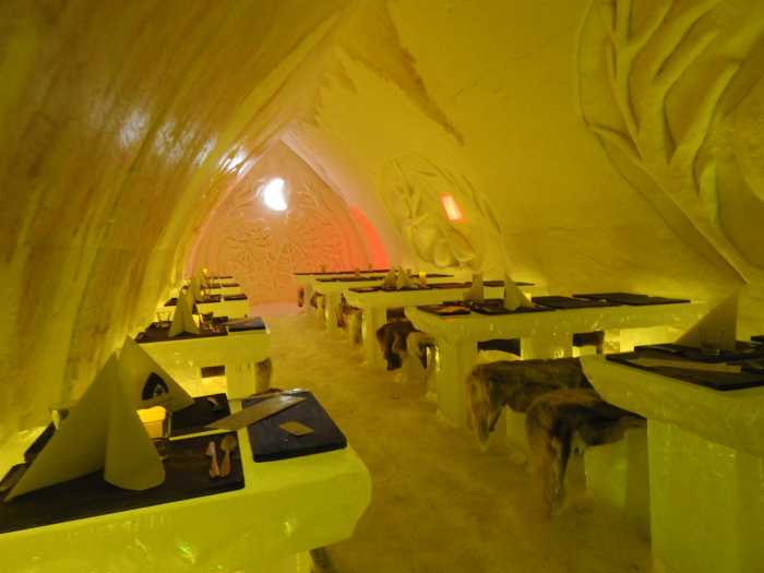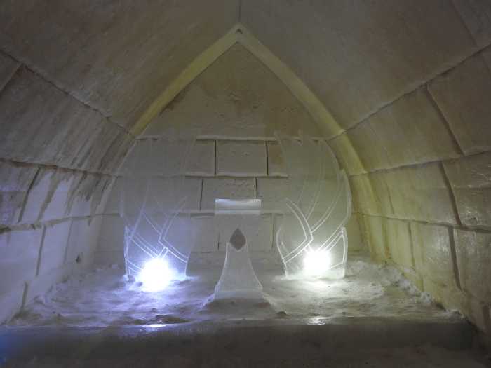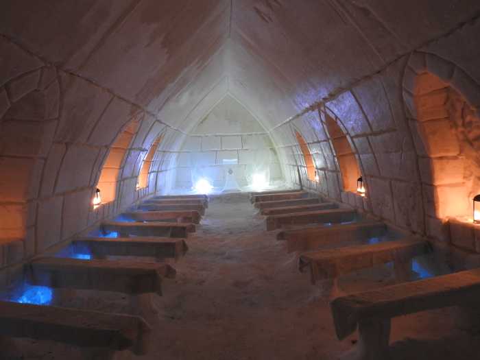 sit on skins to eat, an ice bar of course to warm your insides up I would think, a Chapel with a glorious altar and many unique rooms that people can book.