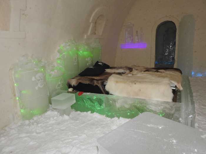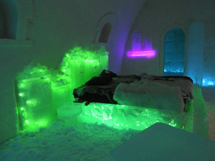 Each room has a theme, with ice carvings on the walls, lighting to accentuate the images and of course an ice bed…. Skins and appropriate sleeping bags