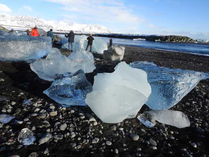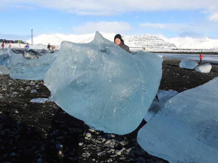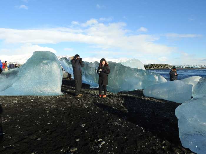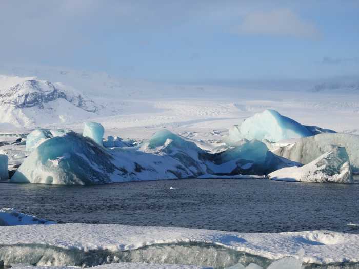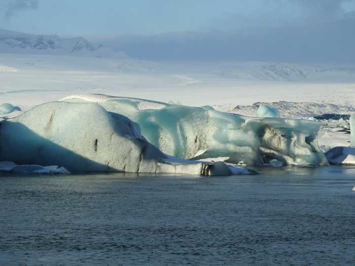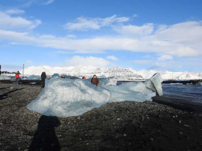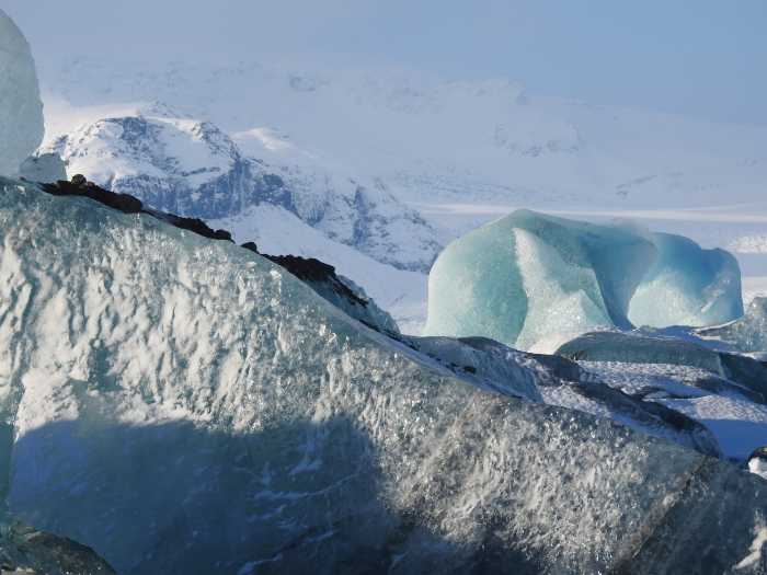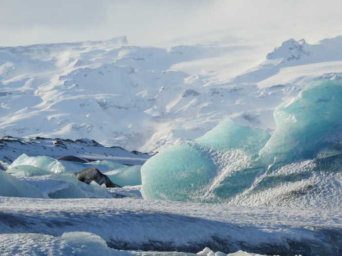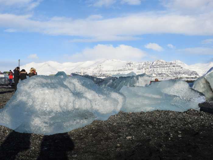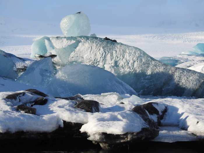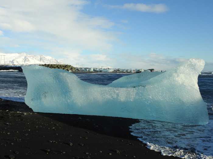 There is lots of snow here on the ground and many visitors come to see this spectacular sight. This lagoon is 180m deep and a natural formation The icebergs float in and settle on the sides of the lagoon or simply float about. They are washed down from the Breiðamerkurjökull Glacier and settle before washing out to Diamond Beach. There are seals here as well that play amongst the ice and seem to enjoy the terrain. The colours of these icebergs are just unique and so different it is so interesting. There are blues, greens, black and sometimes just clear like glass. The mountains in the background really add to the landscape and we were amazed at how some of the blocks of ice found a place to sit on top of some very odd formations under them. Walking around the lagoon was a real experience and it was fabulous to see something very different.