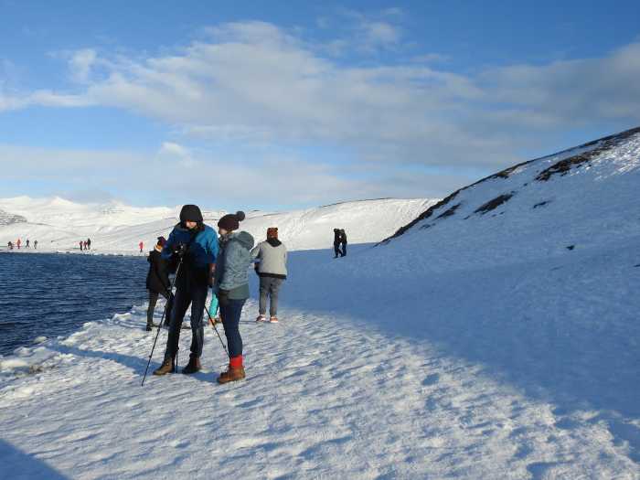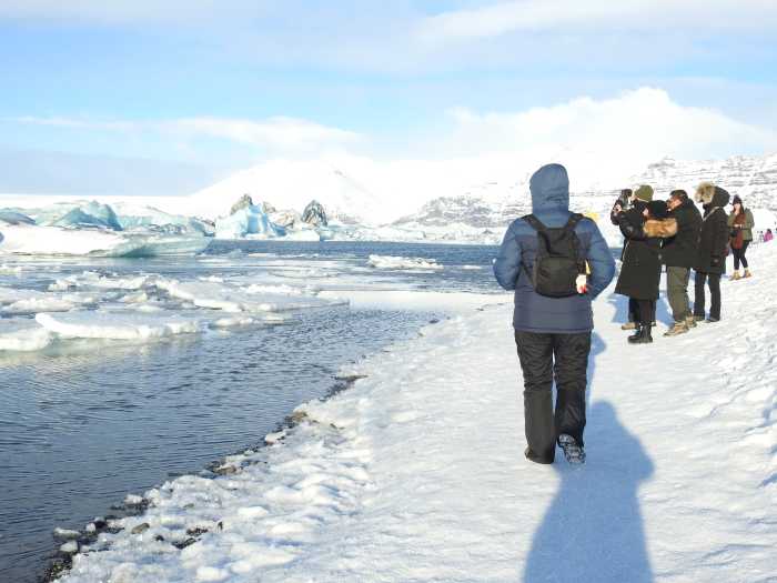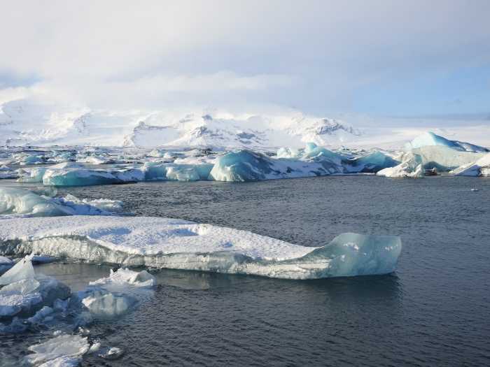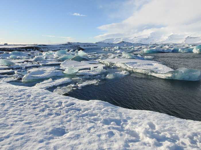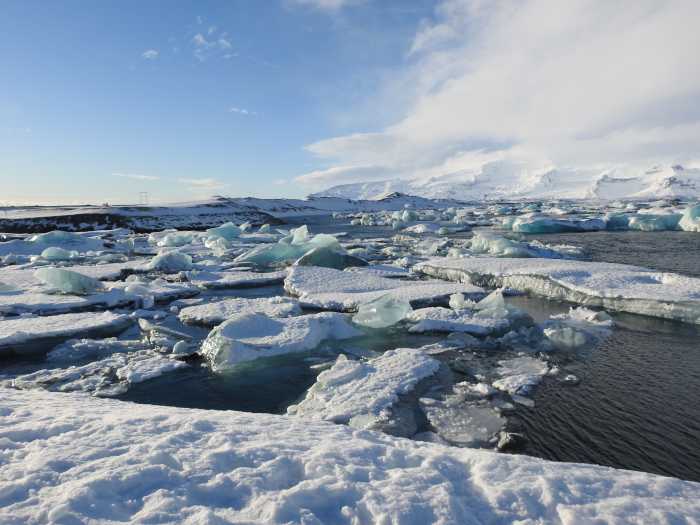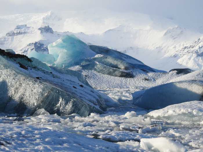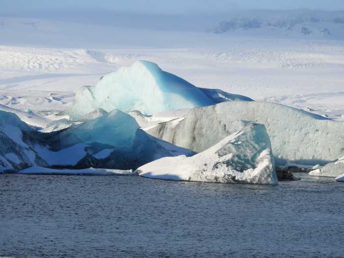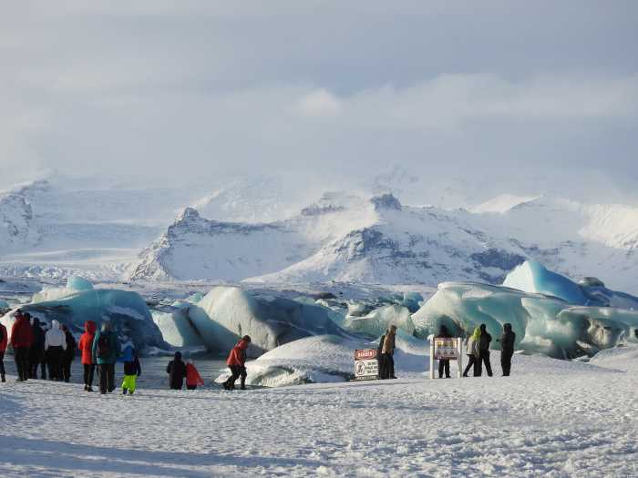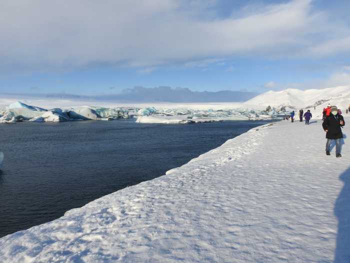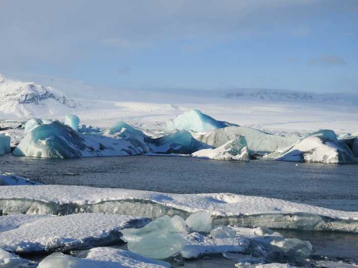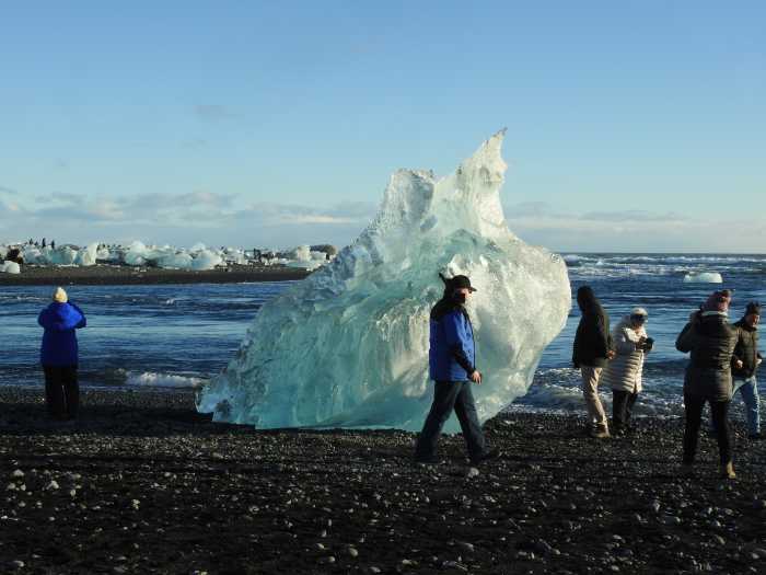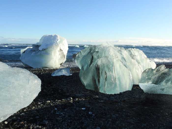 There is lots of snow here on the ground and many visitors come to see this spectacular sight. This lagoon is 180m deep and a natural formation The icebergs float in and settle on the sides of the lagoon or simply float about. They are washed down from the Breiðamerkurjökull Glacier and settle before washing out to Diamond Beach. There are seals here as well that play amongst the ice and seem to enjoy the terrain. The colours of these icebergs are just unique and so different it is so interesting. There are blues, greens, black and sometimes just clear like glass. The mountains in the background really add to the landscape and we were amazed at how some of the blocks of ice found a place to sit on top of some very odd formations under them. Walking around the lagoon was a real experience and it was fabulous to see something very different.