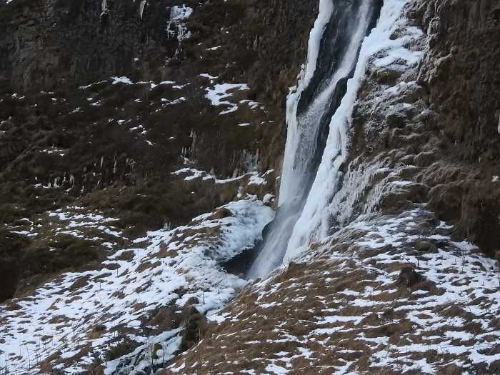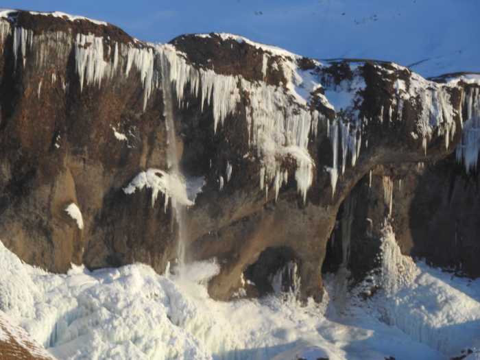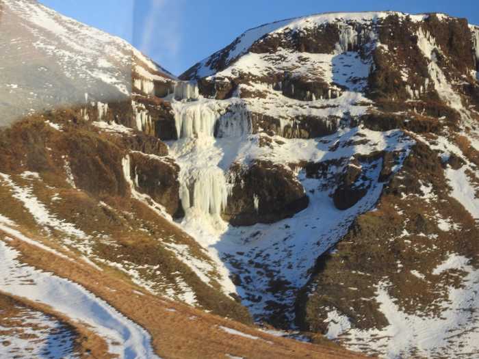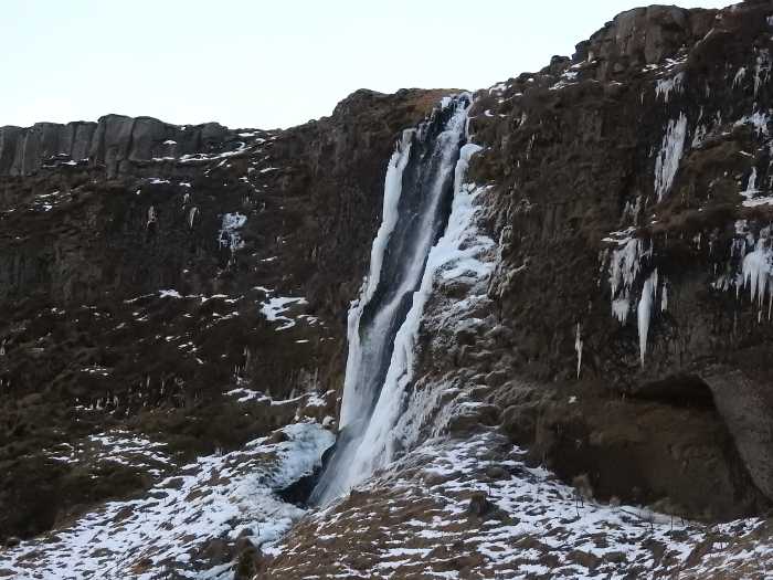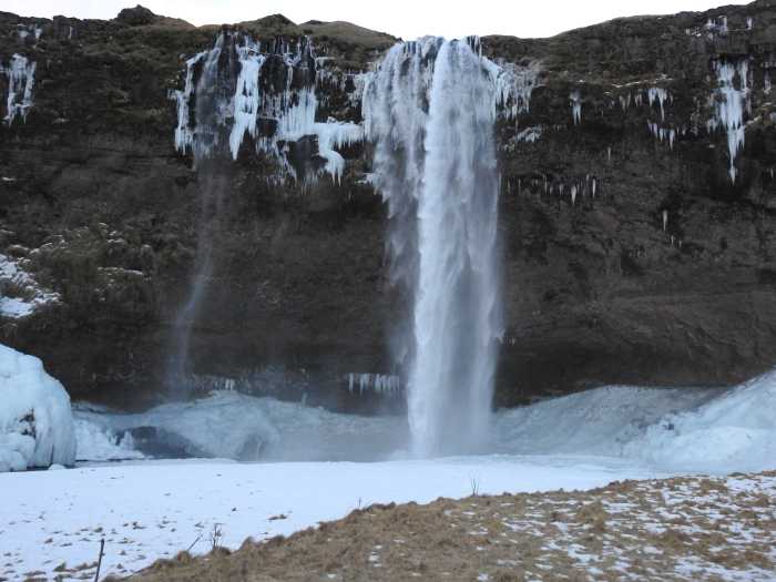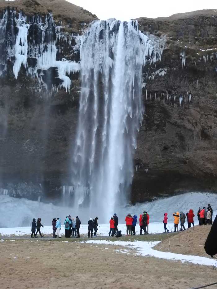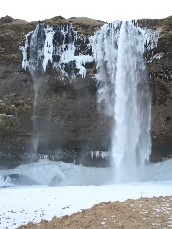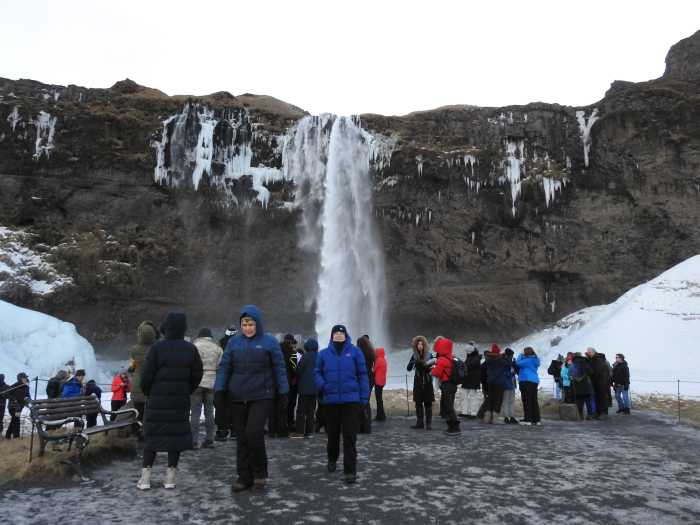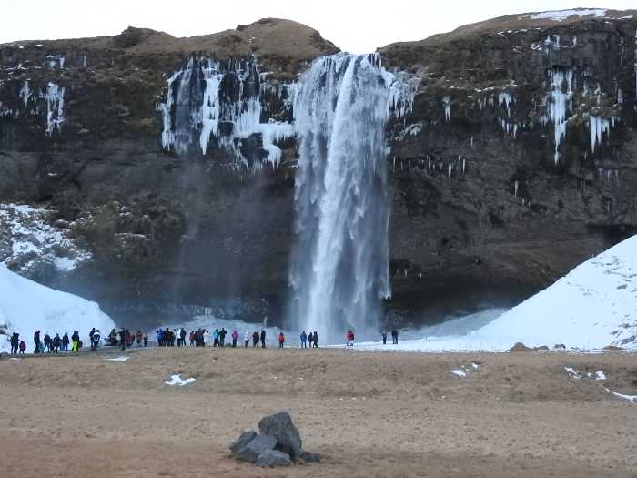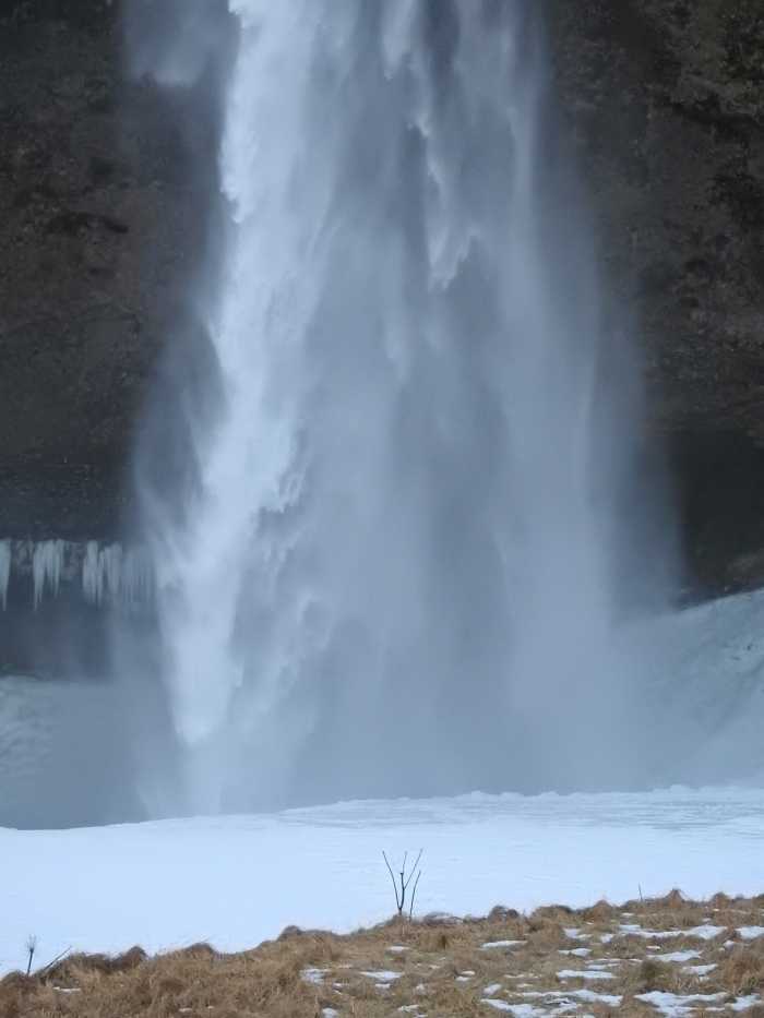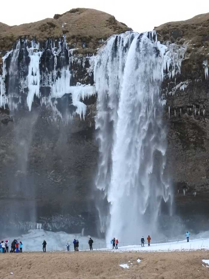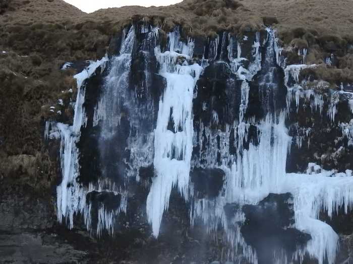 Not long before we arrived at Seljalandsfoss Waterfall. This was one of the highlights as the waterfall was flowing in the most spectacular manner. It seemed like clouds of water were coming down and it was so very special. The ice was frozen in many places around the rushing water and that added to the fabulous vista in front of us. Everyone was stunned to see it and so pleased it was such a sight.