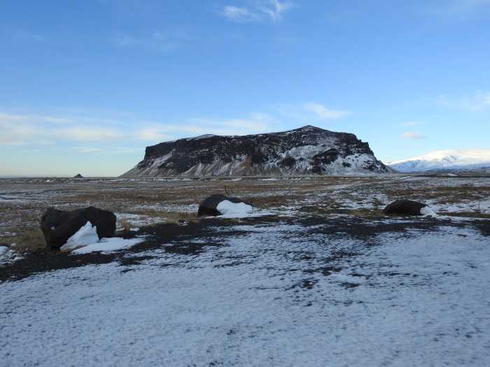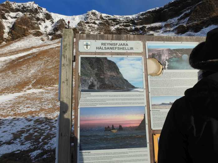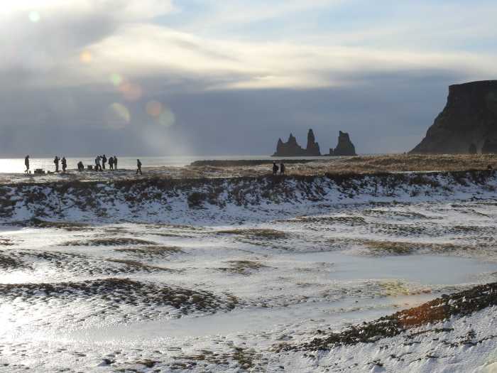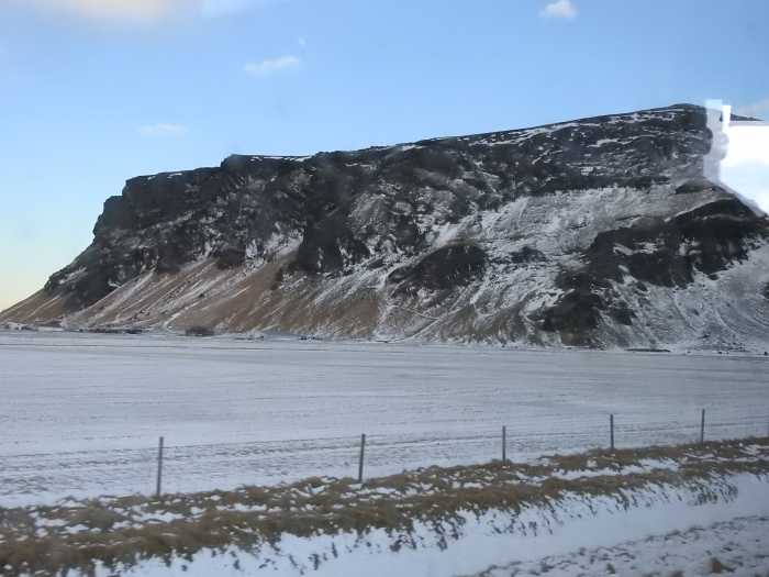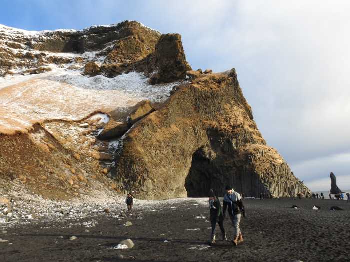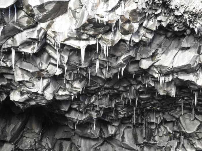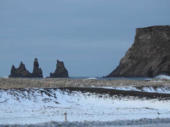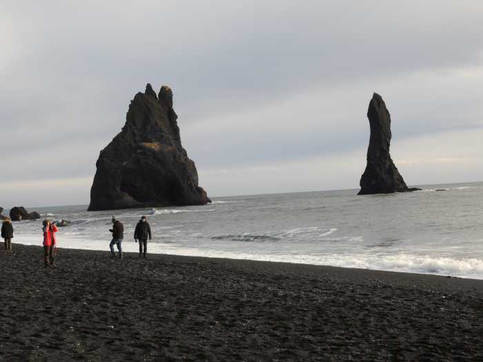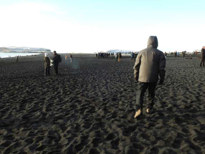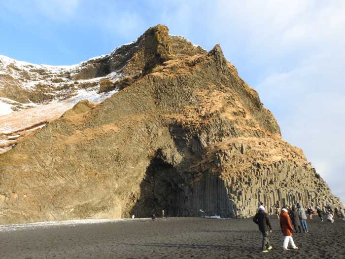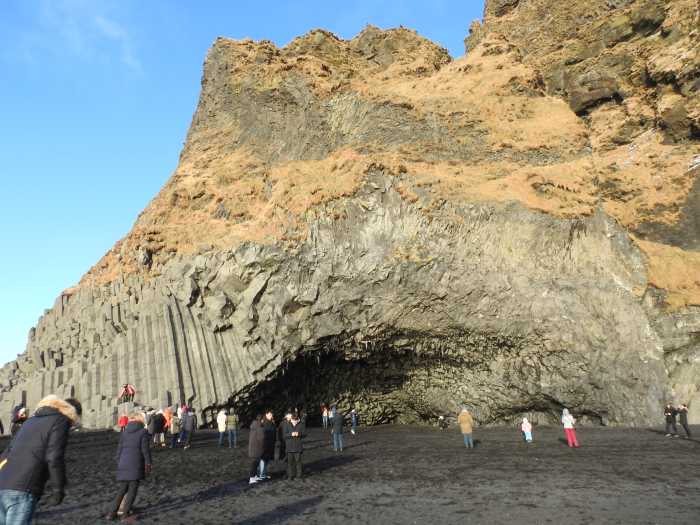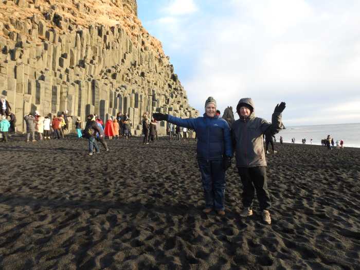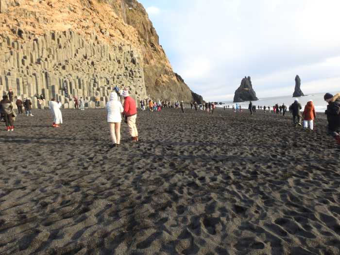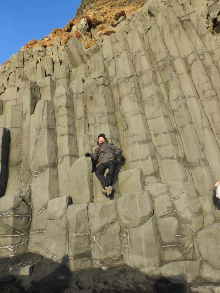 More fabulous mountains covered in snow on our way to visit Reynisfjara Black Beach. On arrival we jumped out onto the black sand and found it very heavy and hard to walk on but lots of fun. This beach is known as one of the most spectacular Black Sand beaches in the world that are not tropical. At first glance, the magnificent tall basalt columns take one’s eyes, and the story with these is that the Trolls used this rock formation to bring ships close to the shore as they wanted to see it closer. However, unfortunately the Trolls stayed out to long and the sun came up, so they were turned to stone. Hence the amazing rock formations on view. The huge cave on the beach is stunning and when we were there, the stalactites that were attached to the ceiling were coming down at various times so we had to be careful. The black pebbles on the beach were smooth and shiny and we all had to pick them up.