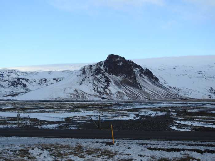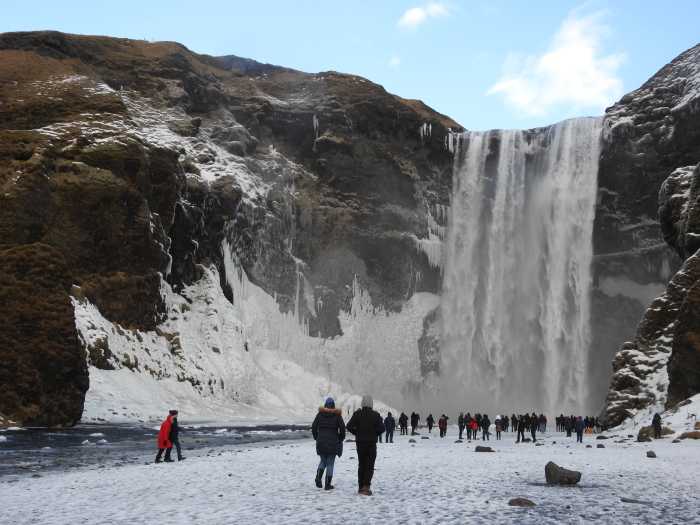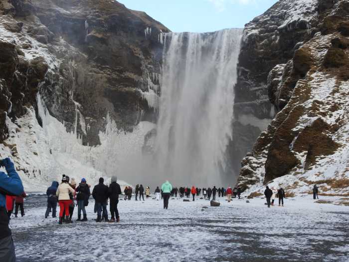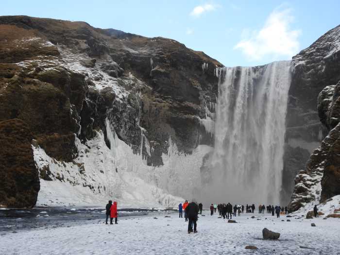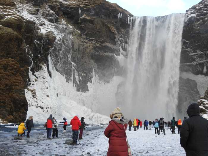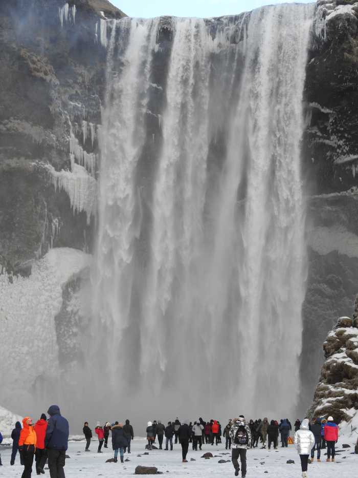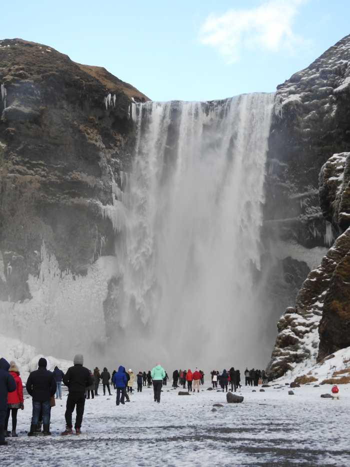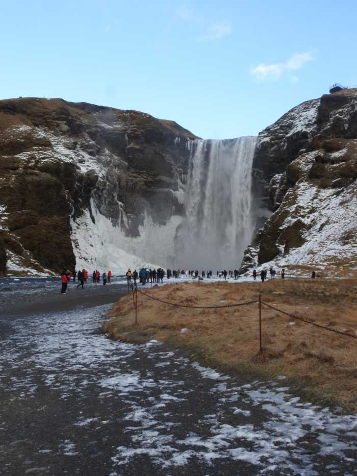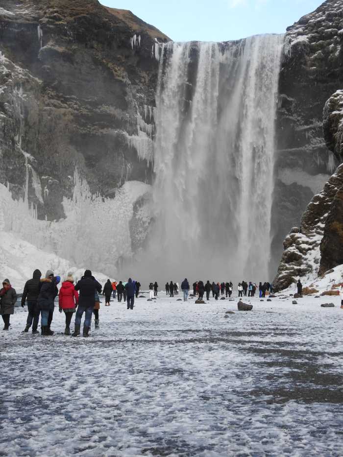 Next stop was to see the magnificent Skogafoss Waterfall. This is one of Iceland’s most spectacular waterfalls and one never to miss. It is known as the biggest with a width of about 80 feet and a fall of almost 200 feet. Thats spectacular and the sound of falling water is just thrilling. One can expect to get wet here if you walk too close but the view is from a little distance to take it all in! Ice was attached to the side walls and that helped to make it even more picturesque! Just one of the magnificent natural wonders that Iceland has to offer.